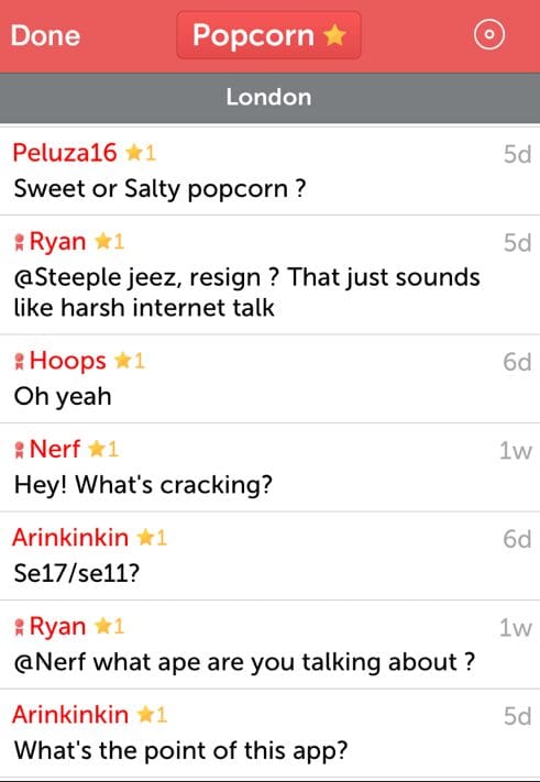Once you sign up for the service, you should see the on-going conversations taking place in your area. If there are not enough users in a particular area, the app will encourage you to invite more users to Popcorn.