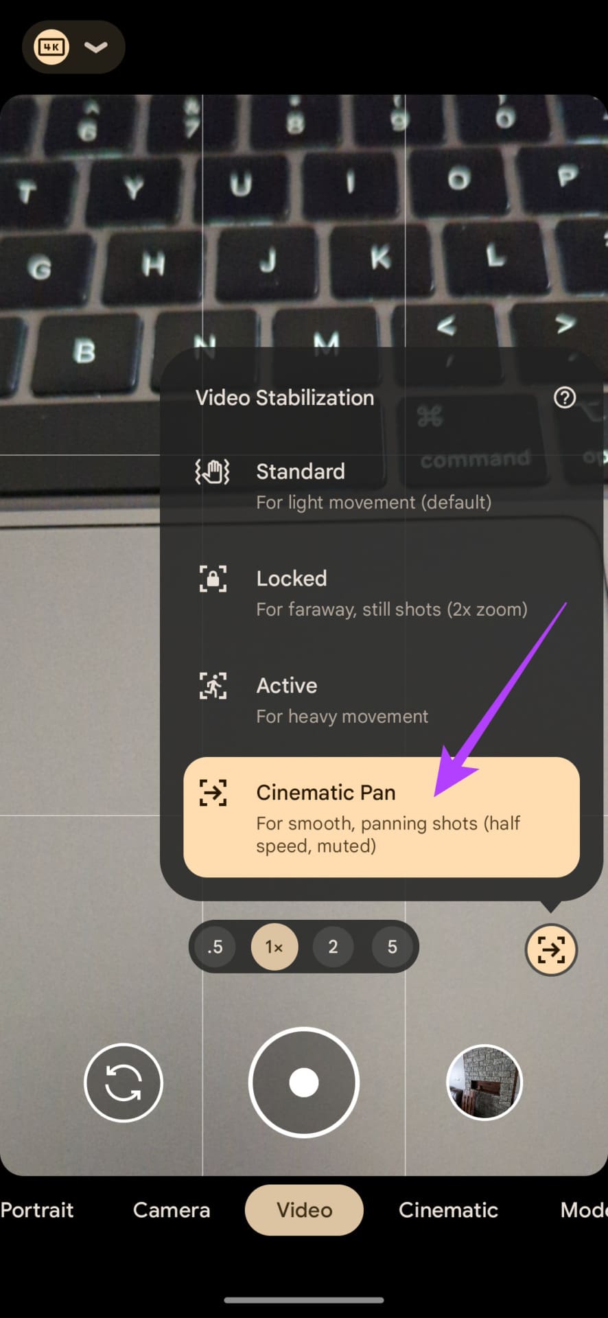 Step 3: Tap on the stabilization icon. Now, choose Cinematic Pan.