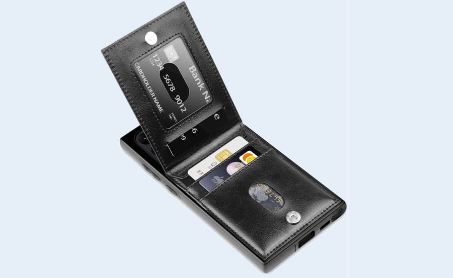This Spigen case holds up to 2 cards. Here, you simply need to slide the cover to take out the cards, just like the Vofolen case. The only difference is that this case is slim and lets you charge the phone wirelessly.