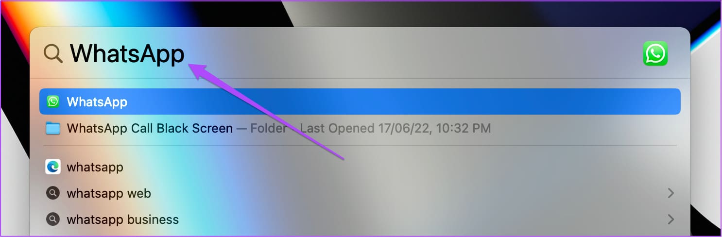 Step 1: Press Command + Spacebar to open Spotlight Search, type WhatsApp, and press Return.