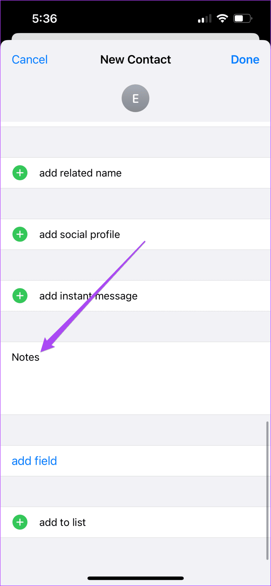 Step 4: After entering the group name, scroll down and look for the Notes section.