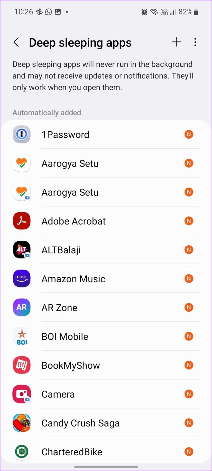 By default, One UI limits battery usage for apps you don’t use often. Fundamentally, that saves battery juice, but the practice may delay notifications since they can’t fetch new data in the background. You can check such sleeping apps from the Settings menu and even disable the option entirely.