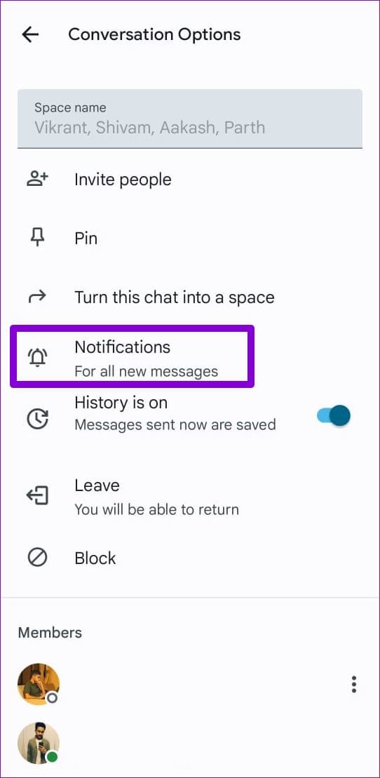 Step 1: In the Google Chat app, open the group or space conversation for which notifications are not working.