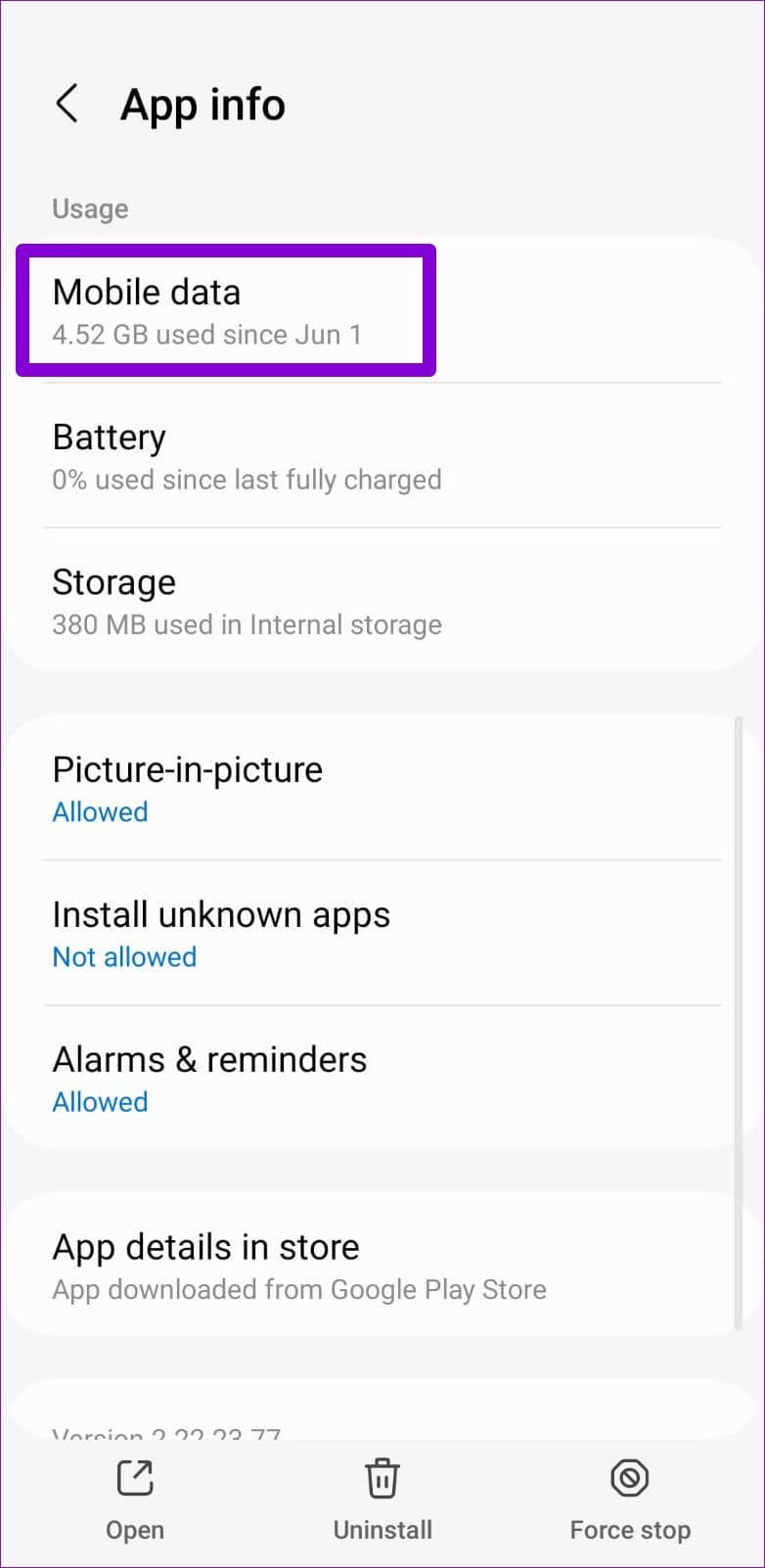 Step 3: Return to the App info page, tap on Battery, and select Unrestricted from the following menu.
