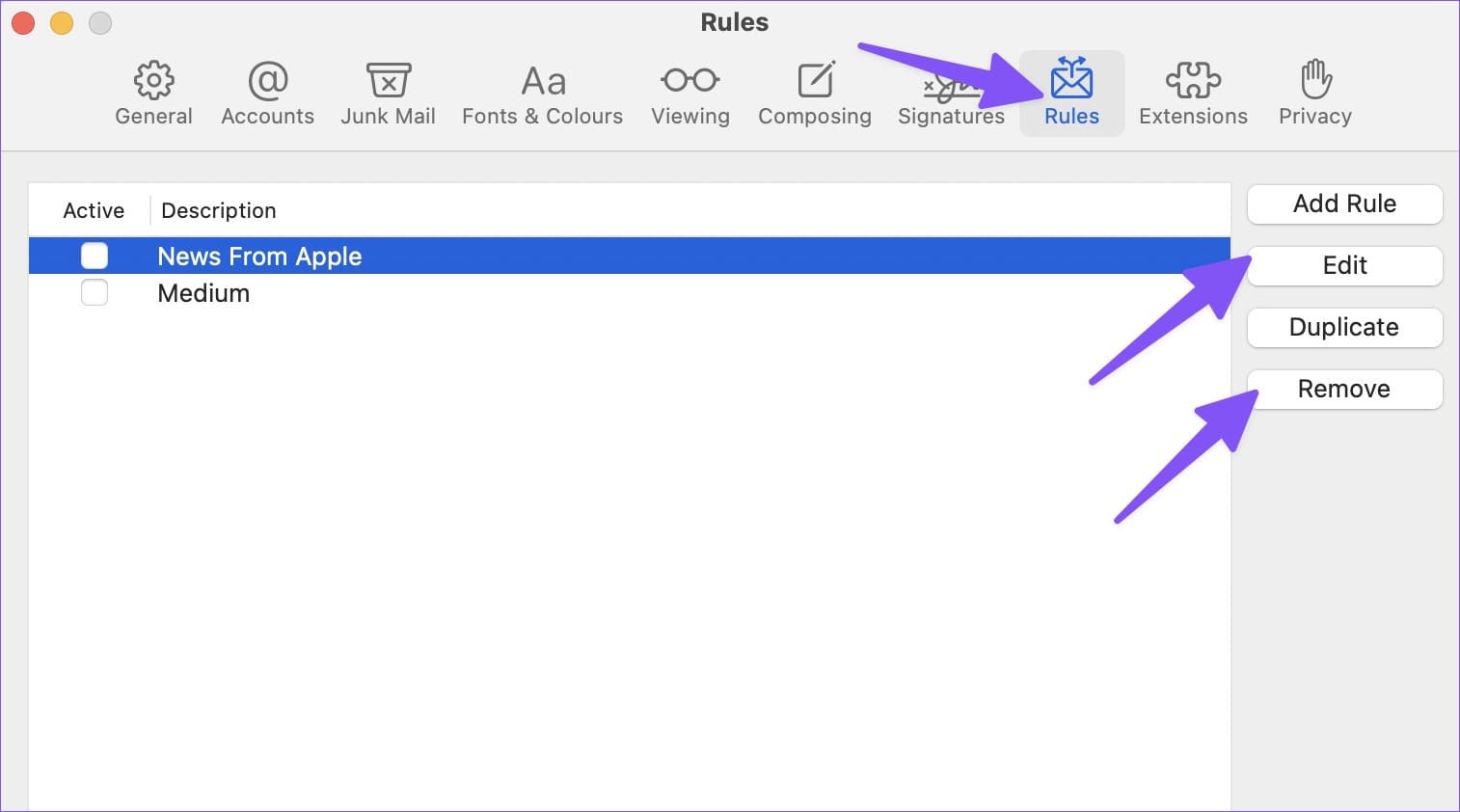 Step 3: Click on the Rules tab. Select a rule and click Edit or Remove button to make changes.
