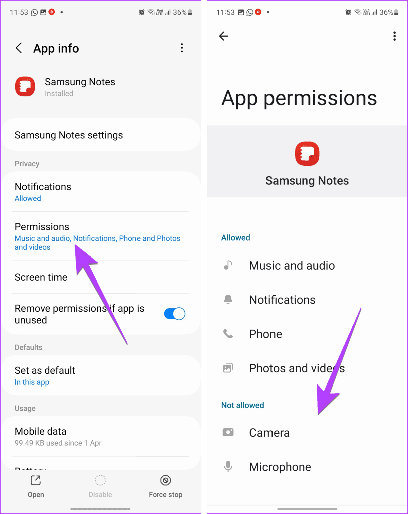 Pro Tip: After step 2, turn off the toggle next to ‘Remove permissions if app is unused’, otherwise, you will have to repeatedly grant permissions if you rarely use the Samsung Notes app.