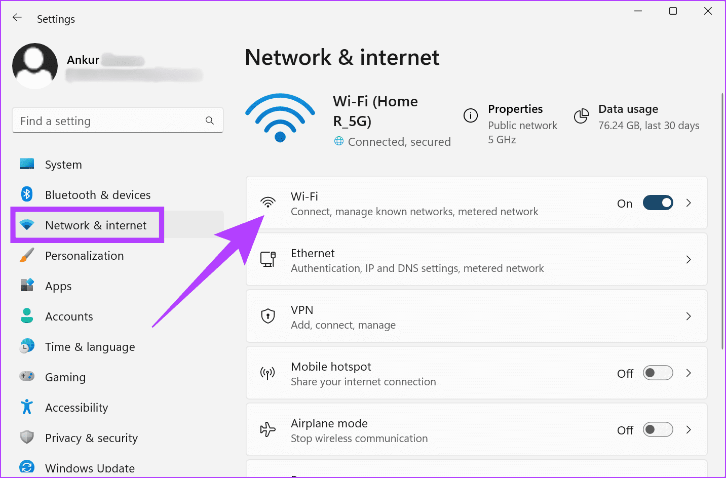 Step 2: Go to Network & internet in the sidebar and click on Wi-Fi.