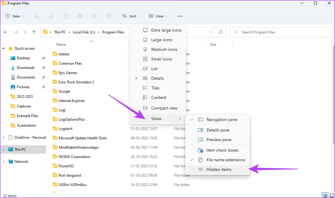 Step 3: Hover your mouse over the Show button. Then, select the Hidden items option.