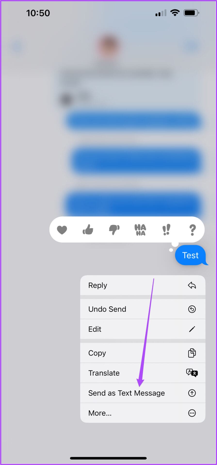 Step 4: Quickly press and hold on the message bubble that you just sent to reveal options.