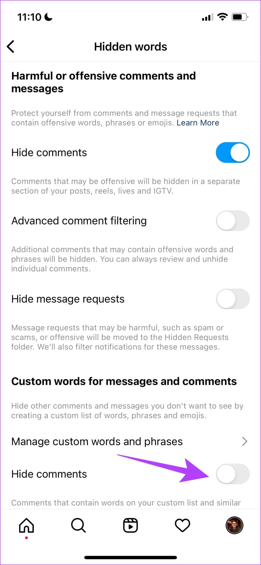 Step 8: Turn on the toggle for Hide comments under the ‘Custom words for messages and comments’ option.