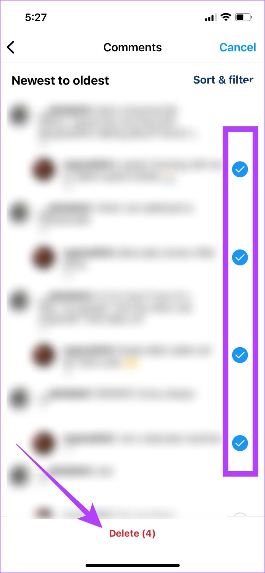 Step 5: Select all the comments that you want to delete and tap on Delete.