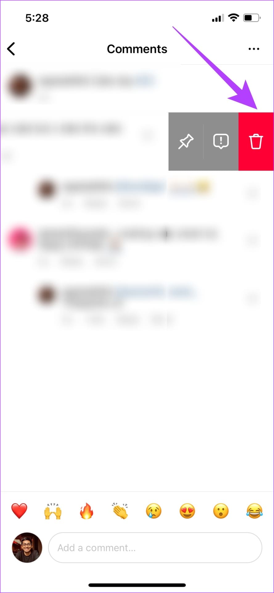 Step 1: In the comment section of your post, swipe left on the comment.