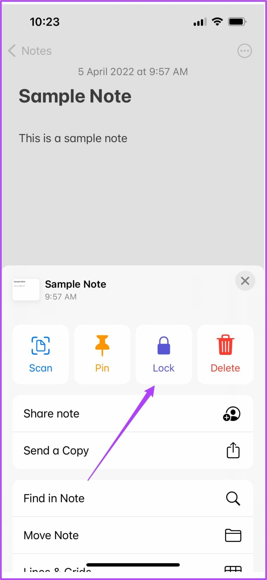 Step 2: From the menu that opens, tap on the Lock Note option.