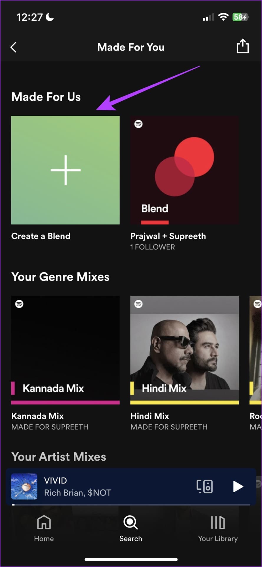 Step 2: You will find a bunch of artists offering a Spotify Blend playlist. Tap on any of them.