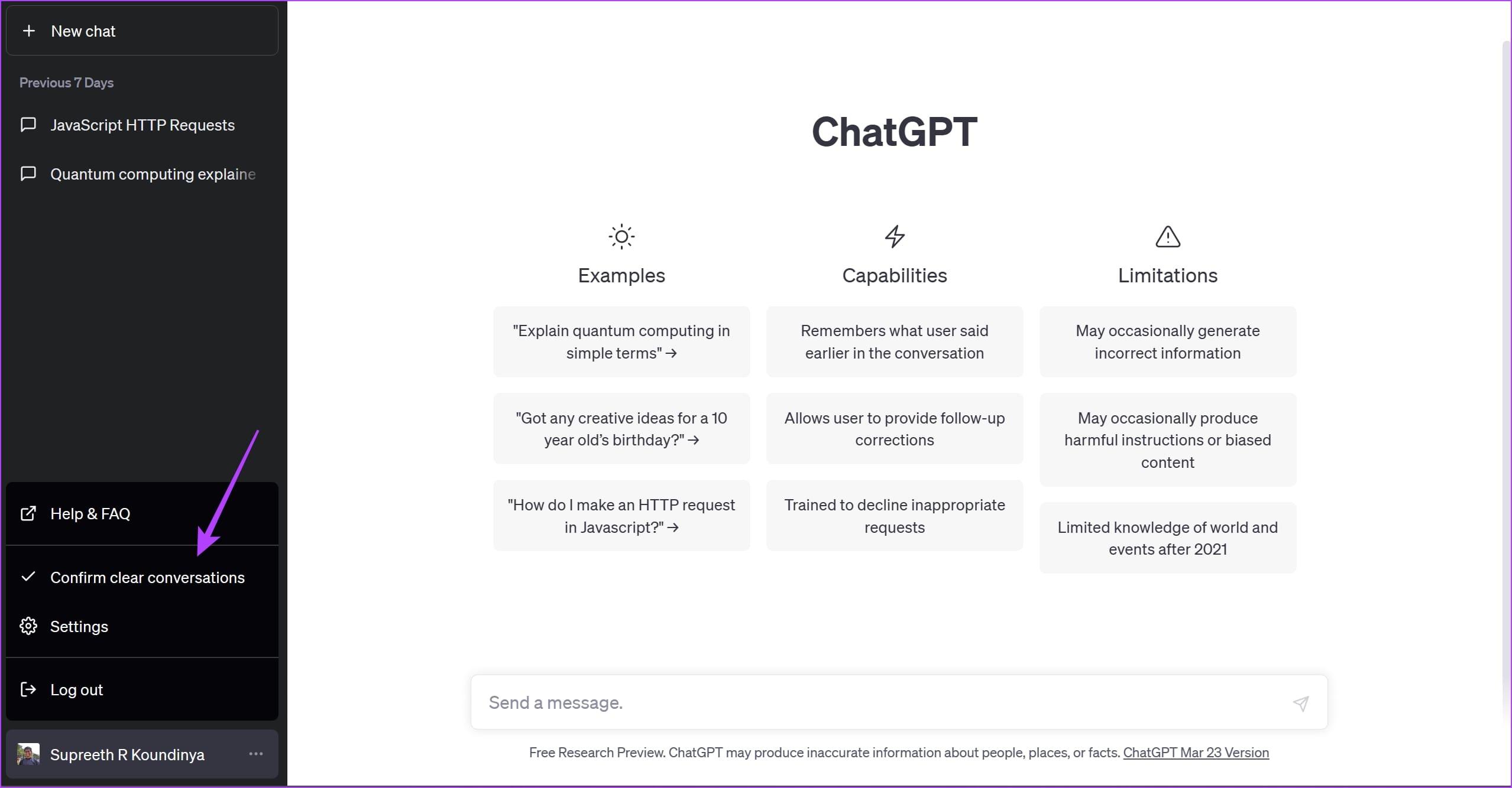 This deletes all your conversation history on ChatGPT. However, if you feel that doing this regularly is a hassle, you may entirely disable the conversation history feature on ChatGPT.