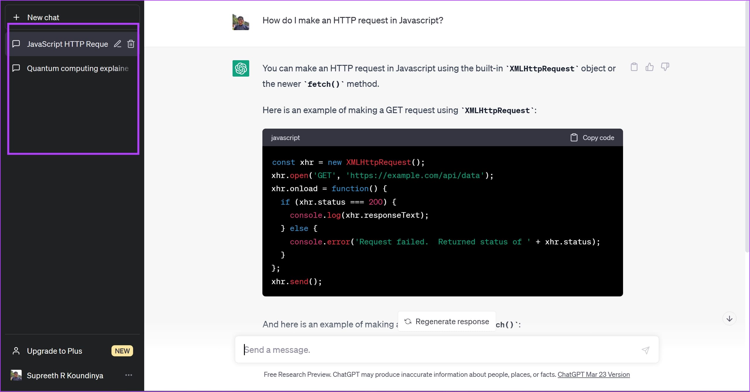 Step 2: Once you Login, you will be able to see the conversation history on the sidebar.