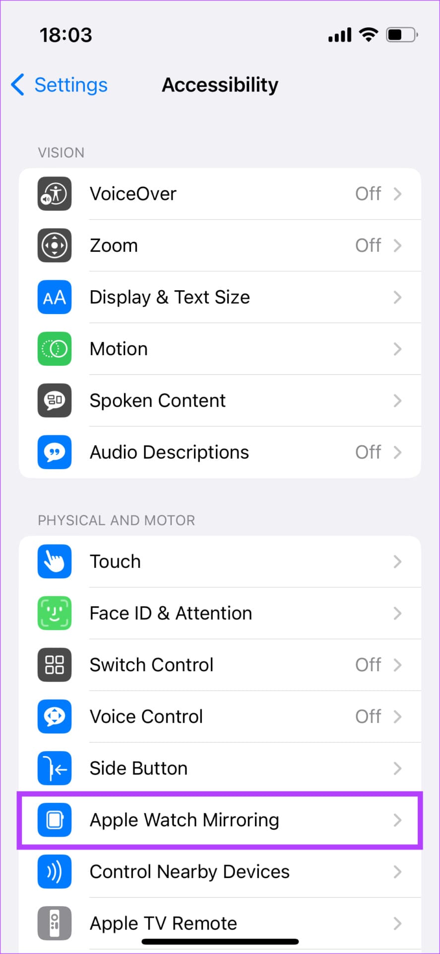 Step 3: Under Physical and Motor, choose the ‘Apple Watch Mirroring’ option.