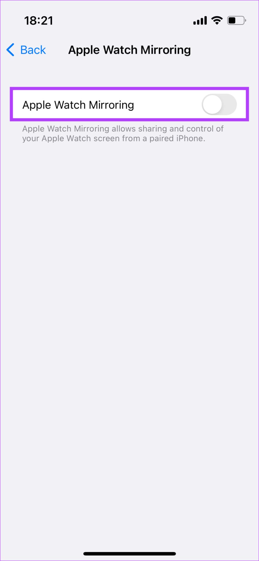 Step 4: Turn on the toggle next to ‘Apple Watch Mirroring’.