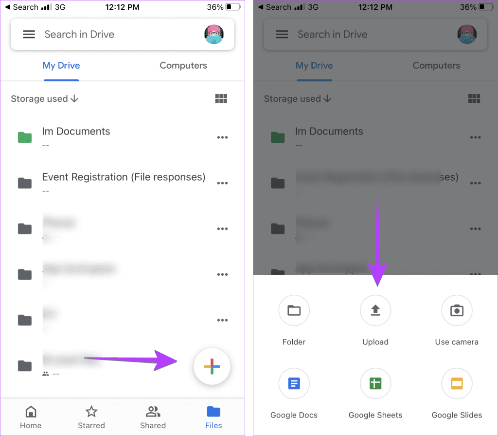 Step 5: Tap on the floating (+) button at the bottom and select Upload.
