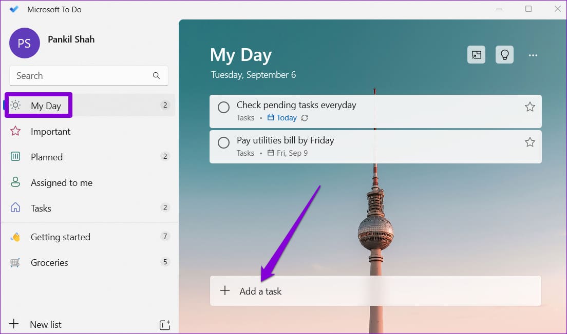 Step 3: In the My Day tab, click the ‘Add a task’ button. Type in your task details and press Enter to save it.
