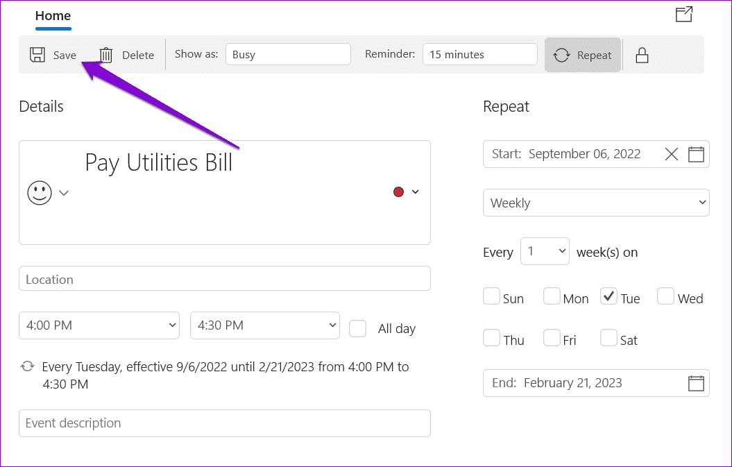 Step 3: Use the drop-down menu beside the Reminder to define when the app should remind you.