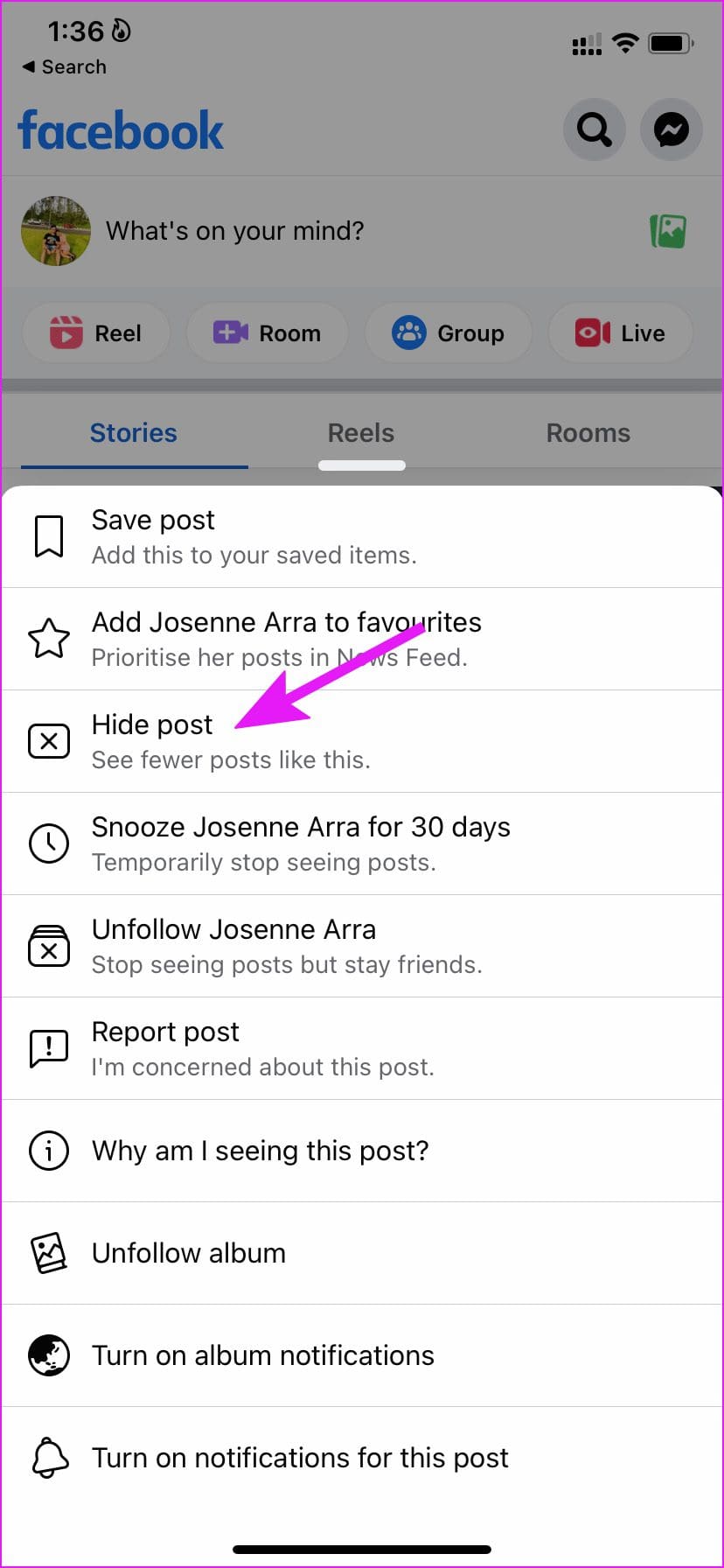 Step 1: From the Facebook news feed, find the friend whose posts you want to snooze for 30 days.
