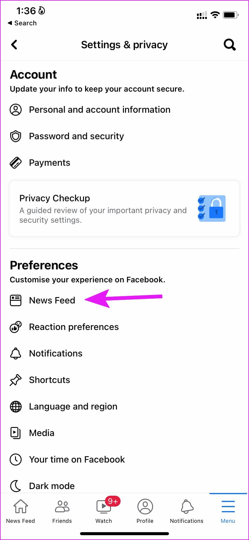 Step 3: Under the Preferences section, tap on News Feed and select Snooze.