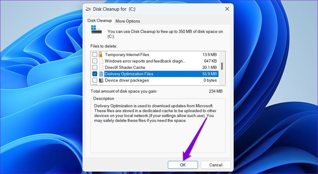 Step 3: Tick the ‘Windows Update Cleanup’ and ‘Delivery Optimization Files’ checkboxes. Then, click on OK.