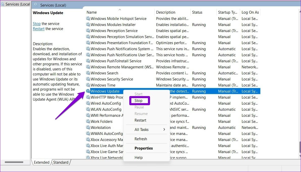 Step 2: In the Services window, you’ll find all the services arranged in alphabetical order. Scroll down to locate Windows Update service, right-click on it and select Stop.