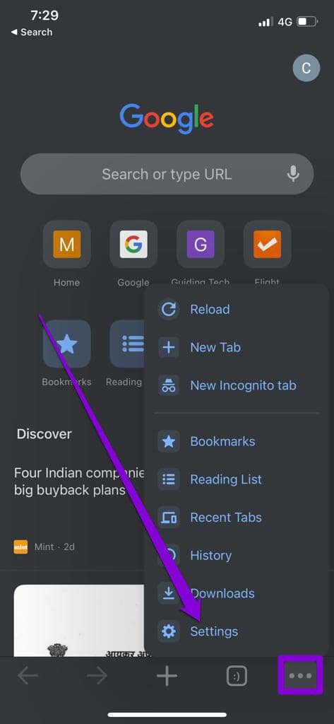 Step 1: Open Chrome on your iPhone. Tap the three-dot menu icon to visit Settings.