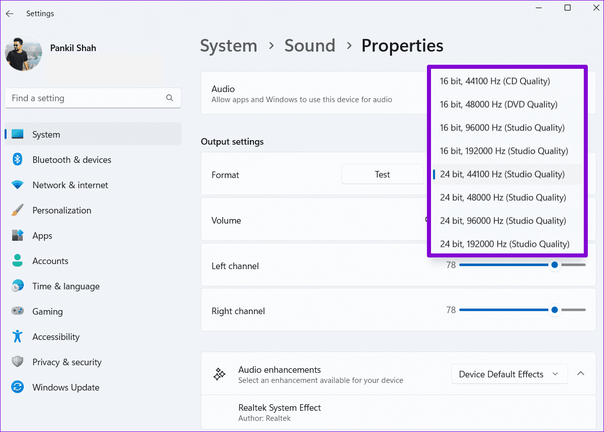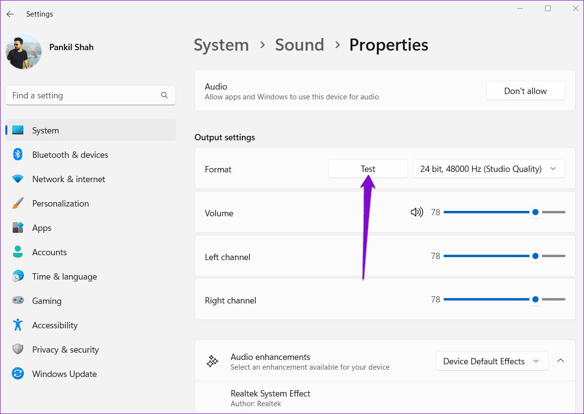 Another thing you can do to improve the sound quality on Windows is to bump up the sample rate and bit depth. This can also be useful if the audio is coming out distorted from Windows. Plus, you can test different sample rates and bit depth on Windows right from the Settings app itself. Here’s how.