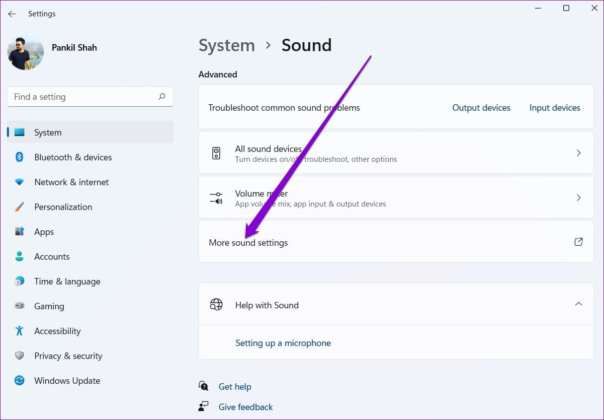 Step 2: Scroll down to Advanced and click on More sound settings.