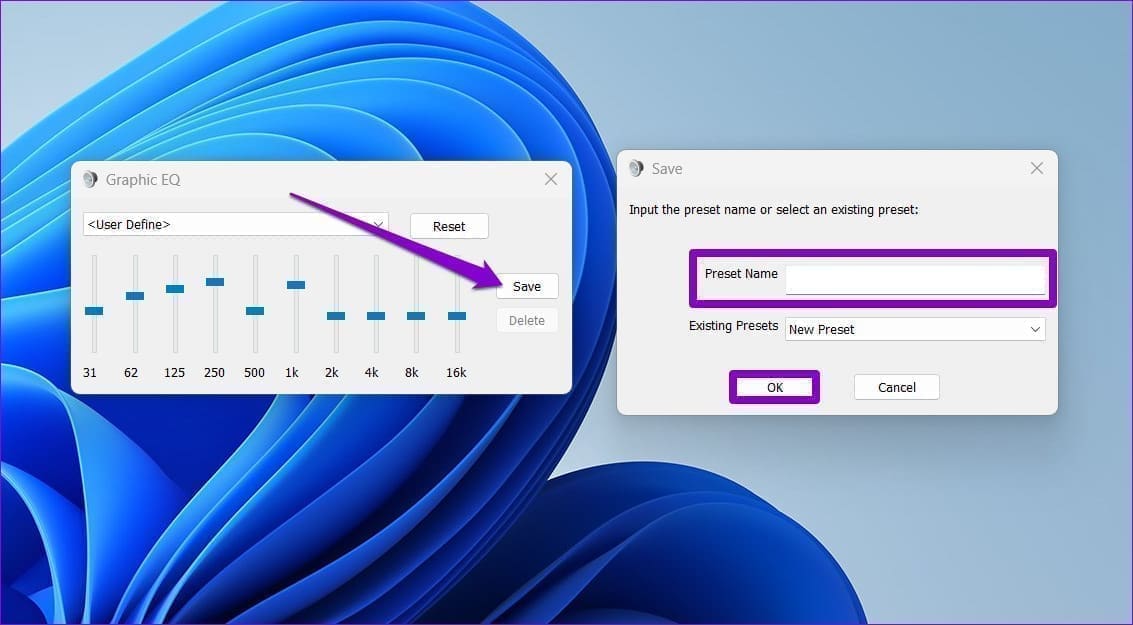 Step 5: After tweaking the equalizer, click on Save. Then enter a name for your preset, and click on OK.
